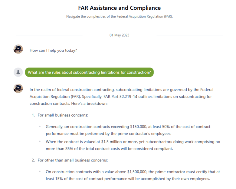 Our AI-powered FAR navigator helps you understand and comply with Federal Acquisition Regulation complexities.