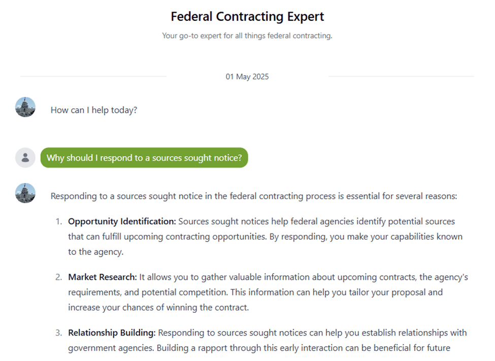 Our intelligent AI assistant provides 24/7 support for all government contracting queries, delivering instant, accurate information and expert guidance whenever you need it, accelerating your decision-making and continuous learning process.