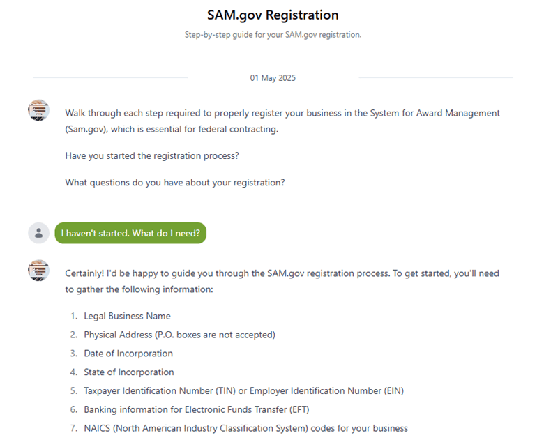 Our AI-powered assistant guides you through the complex SAM.gov registration process step-by-step, ensuring your profile is properly set up and compliant for bidding on federal contract opportunities.